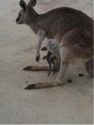 飼育員さんがお腹に袋のある雌カンガルーを見つけて目の前にさっきの子供カンガルーをおろすと、子供はサクサクッとその袋に入っていってしまった。そのカンガルーも始終「我関せず。」で宙を見ていた。本当にこの子供の母親なのか…。実は子供がさっきのと逆だったけど判ってないということもありそうな無関心さだ。