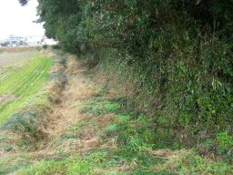 現地は田んぼで、館と言われるその場所も、中にはまだ子孫がお住まいで中には入れないし、風が吹きすさぶ中、「これなのかなぁ。」「わかんない。」と言いながら周囲の土塁(画像)をクルリとまわって10分で、終了。