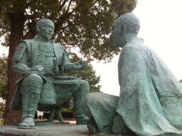 下の画像は、泰平寺公園にあった秀吉と義久の銅像。