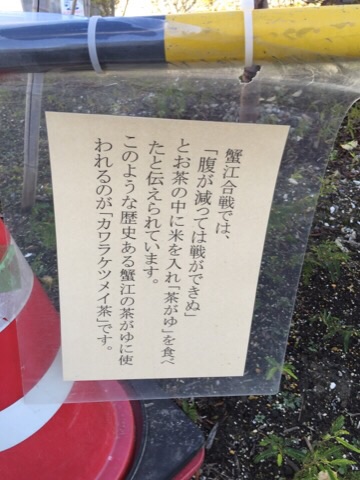 『蟹江合戦では、「腹が減っては戦ができぬ」と、お茶の中に米を入れ「茶がゆ」を食べたと伝えられています。このような歴史ある蟹江の茶がゆに使われるのが「カワラケツメイ茶」です。』