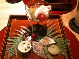 たとえば器にちょこんと2cm四方の食べ物がのっけられて部屋に運ばれてきて、なかなかに上品。