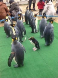 冬季限定のペンギンのパレードというのまであって飼育スペースから屋外に出されたペンギン達が職員に促されて砂の上を行進していた。大きなキングペンギン達の群れの中に、小さなイワトビペンギンが1羽混ぜ込まれていたのだが…。