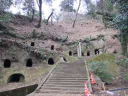 実は、この穴は古代の横穴墓のようで、しかも、城現役中に発見しちゃったらしく、「各穴から人骨が出てきたの。」ということで、これを改葬したらしい。
