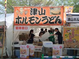 天神で今日と明日とで開催される「九州ご当地グルメコンテスト」には、ゲストグルメということで「津山のホルモンうどん」のブースが立った。