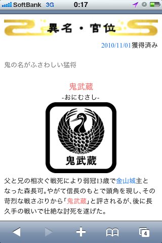 『今日はどこも新しい城をめぐってないのに、なんで異名がもらえるんだ??!』と思い内容を開いてみれば「鬼武蔵」の異名を獲得していた。
